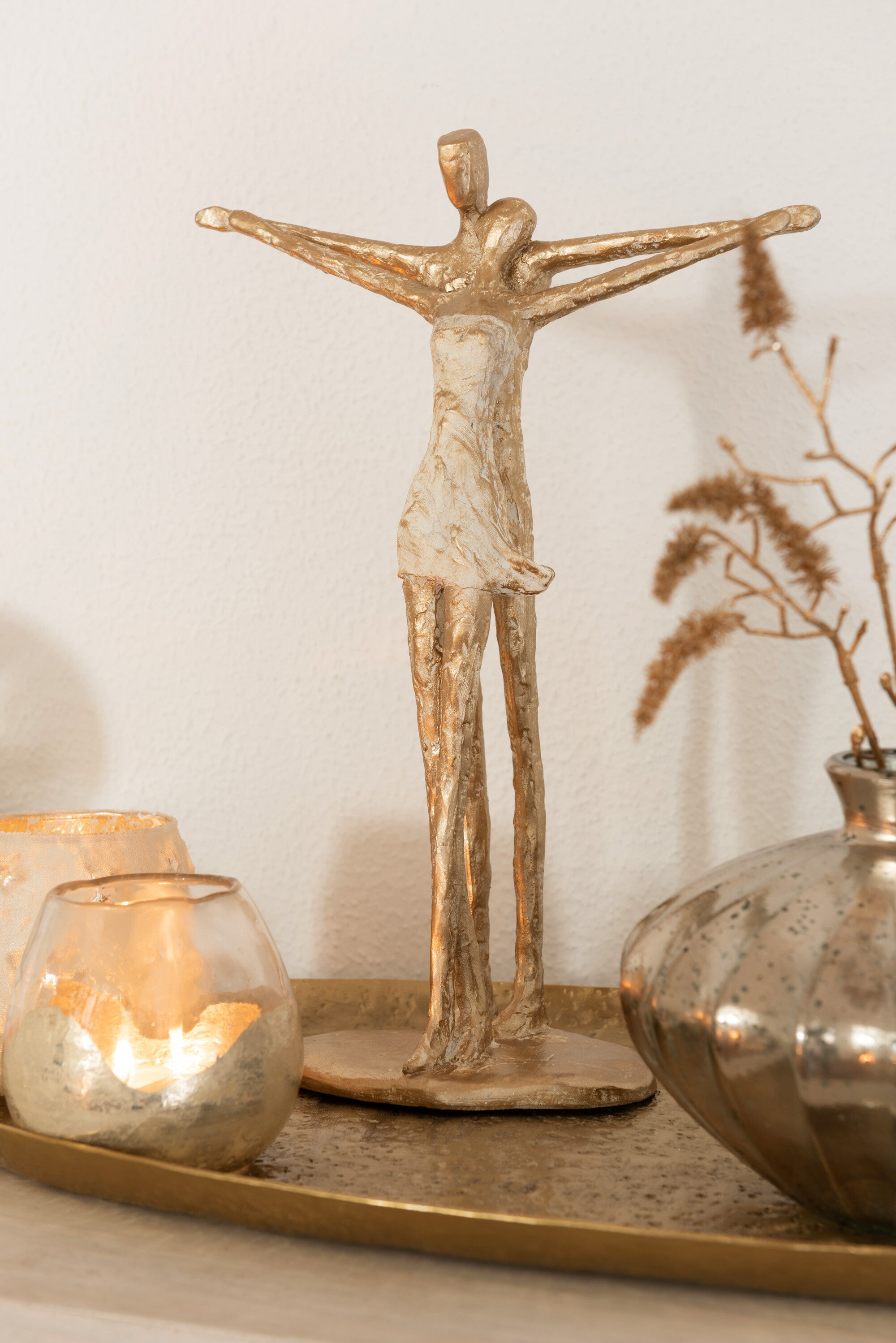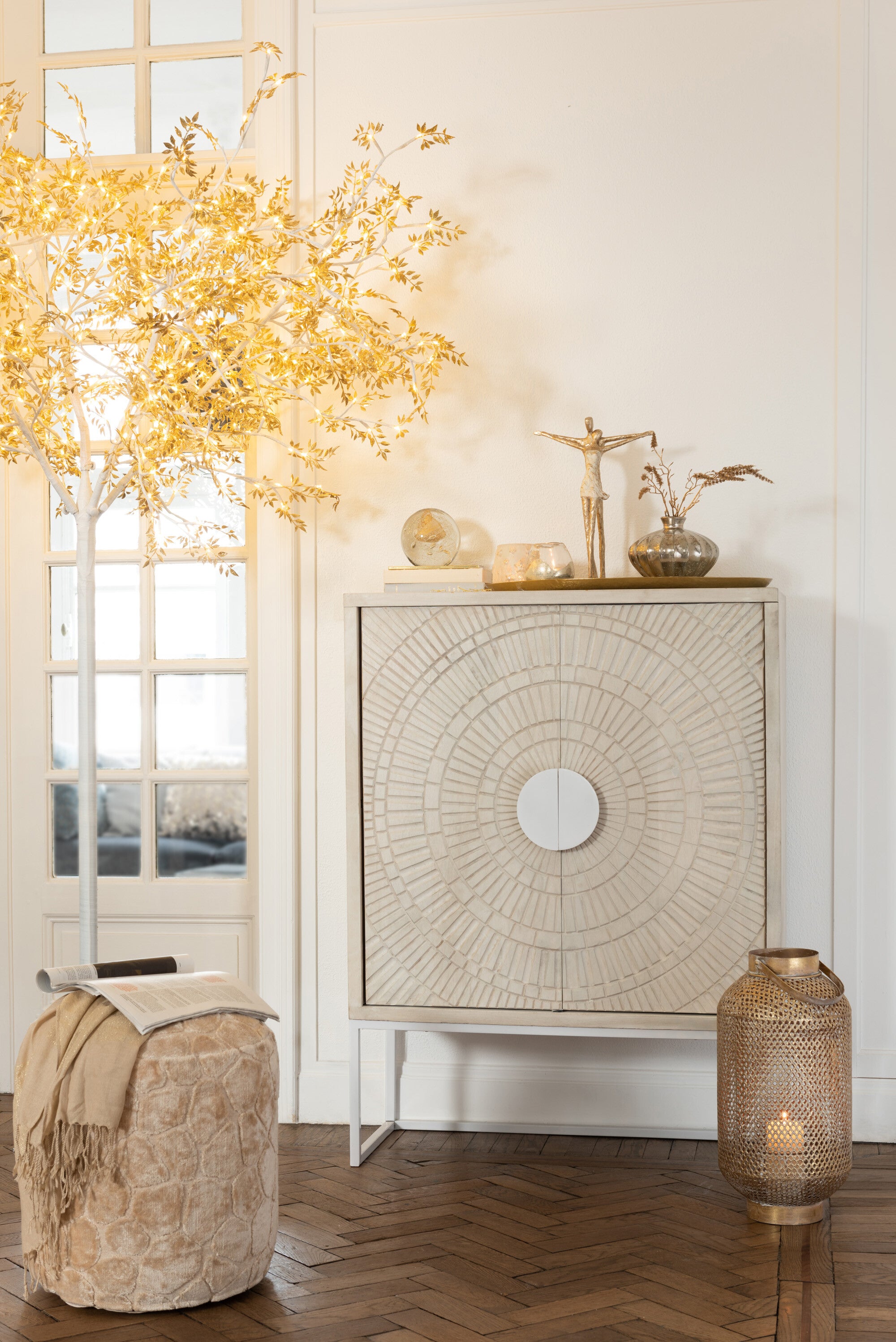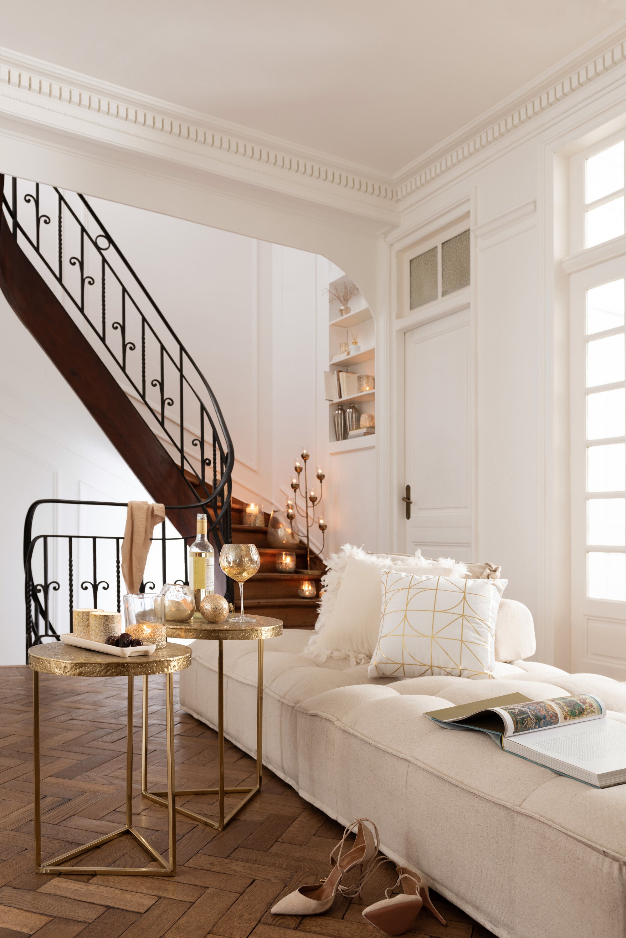 Bring in the bling! Een stijl die je zowel op een klassieke als op een moderne manier kunt toepassen. Als basis gebruik je metalen met een gouden glans die zelfs wit en alle soorten hout doen shinen. Decoreer rijkelijk maar elegant: groepeer je decoraties op mooie grote metalen trays. Steek jij de kaarsjes aan?
