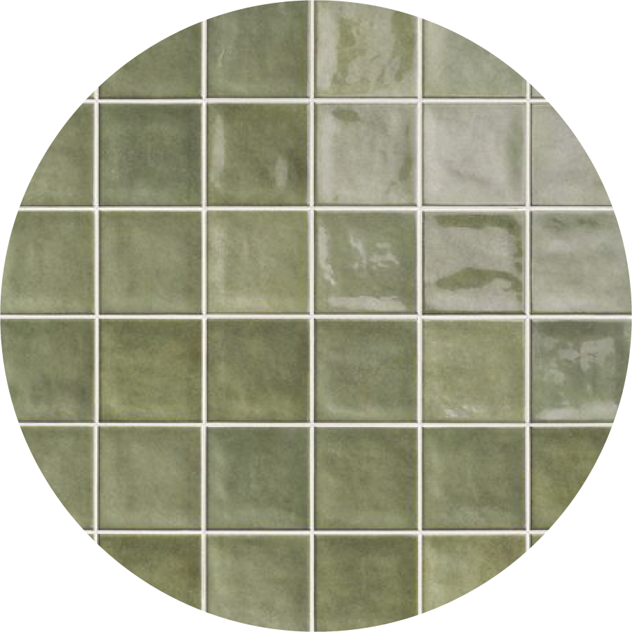 " Leuk in deze stijl zijn groene tegeltjes. Kun je ze nergens op de wand kwijt, gebruik ze dan als onderzetters "