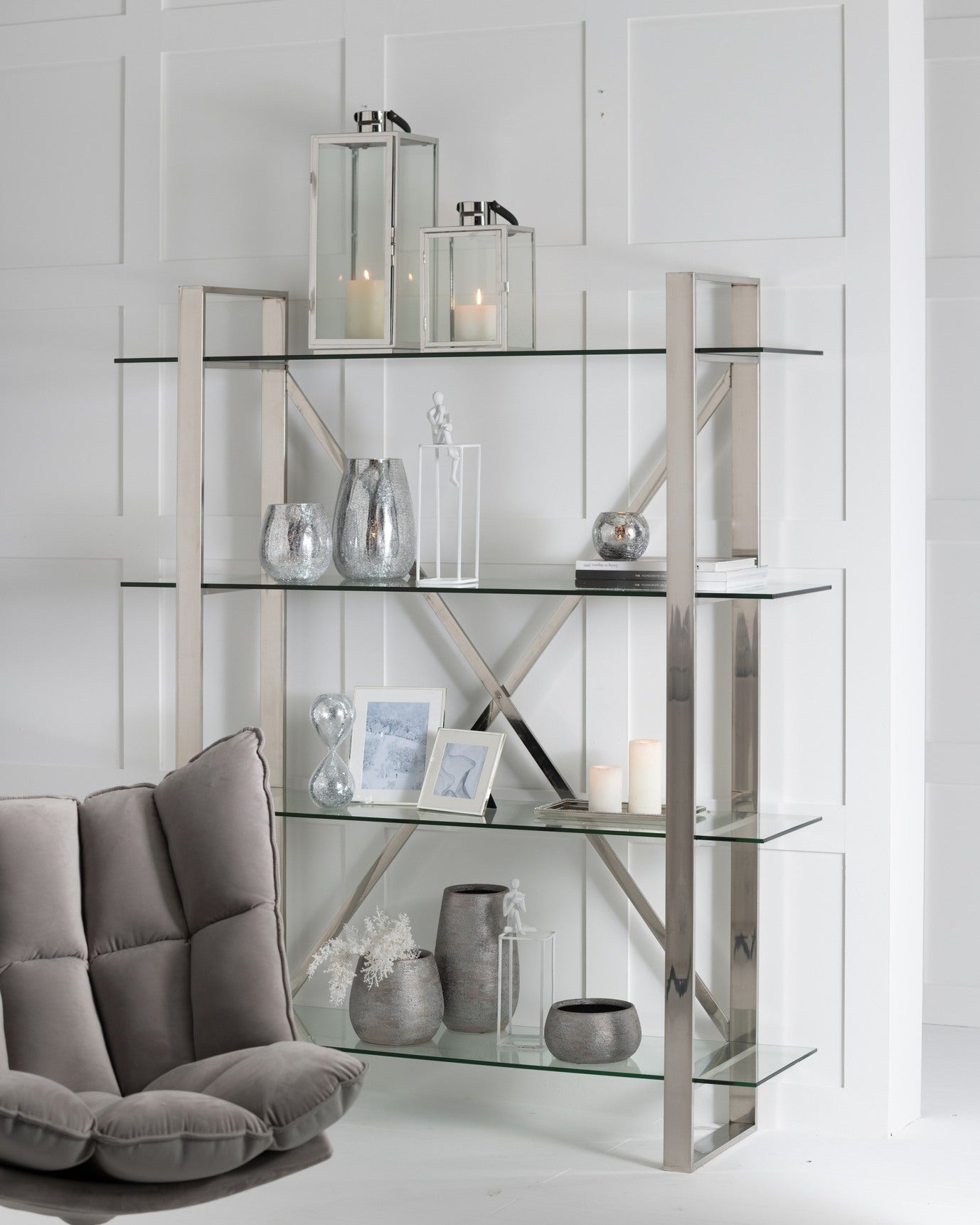 " De openheid die deze stijl kenmerkt, bewaar je door te decoreren met veel glas. Het glas versterkt het effect van je zilveren en chromen accessoires. "
